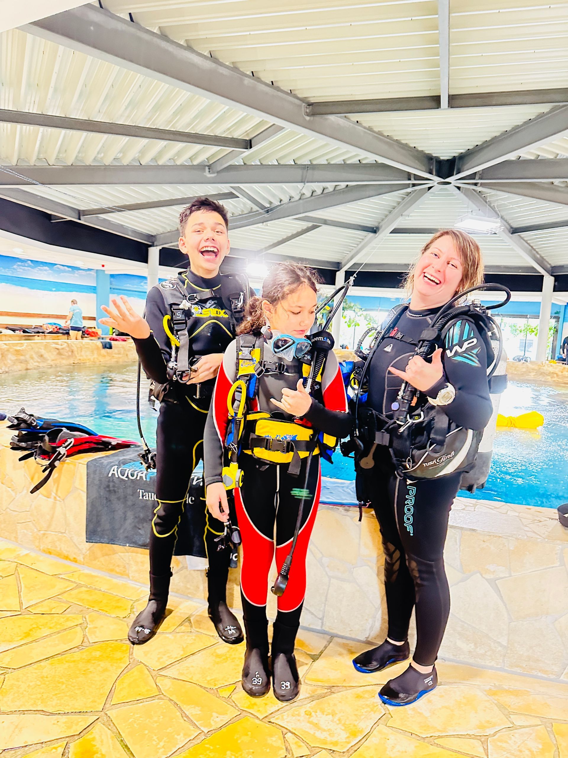 Du lernst vorab, wie deine Ausrüstung funktioniert, was beim Atmen unter Wasser besonders wichtig ist und wie du mit deinem Tauchlehrer unter Wasser kommunizierst ohne zu reden.